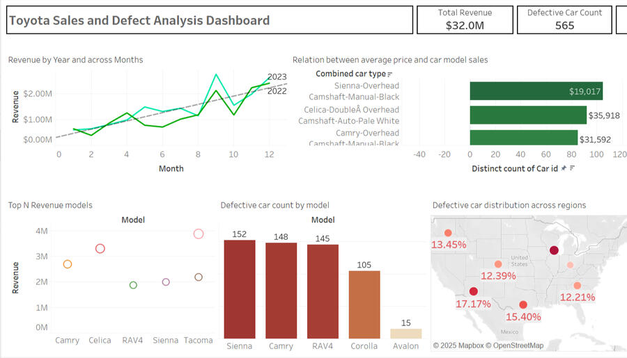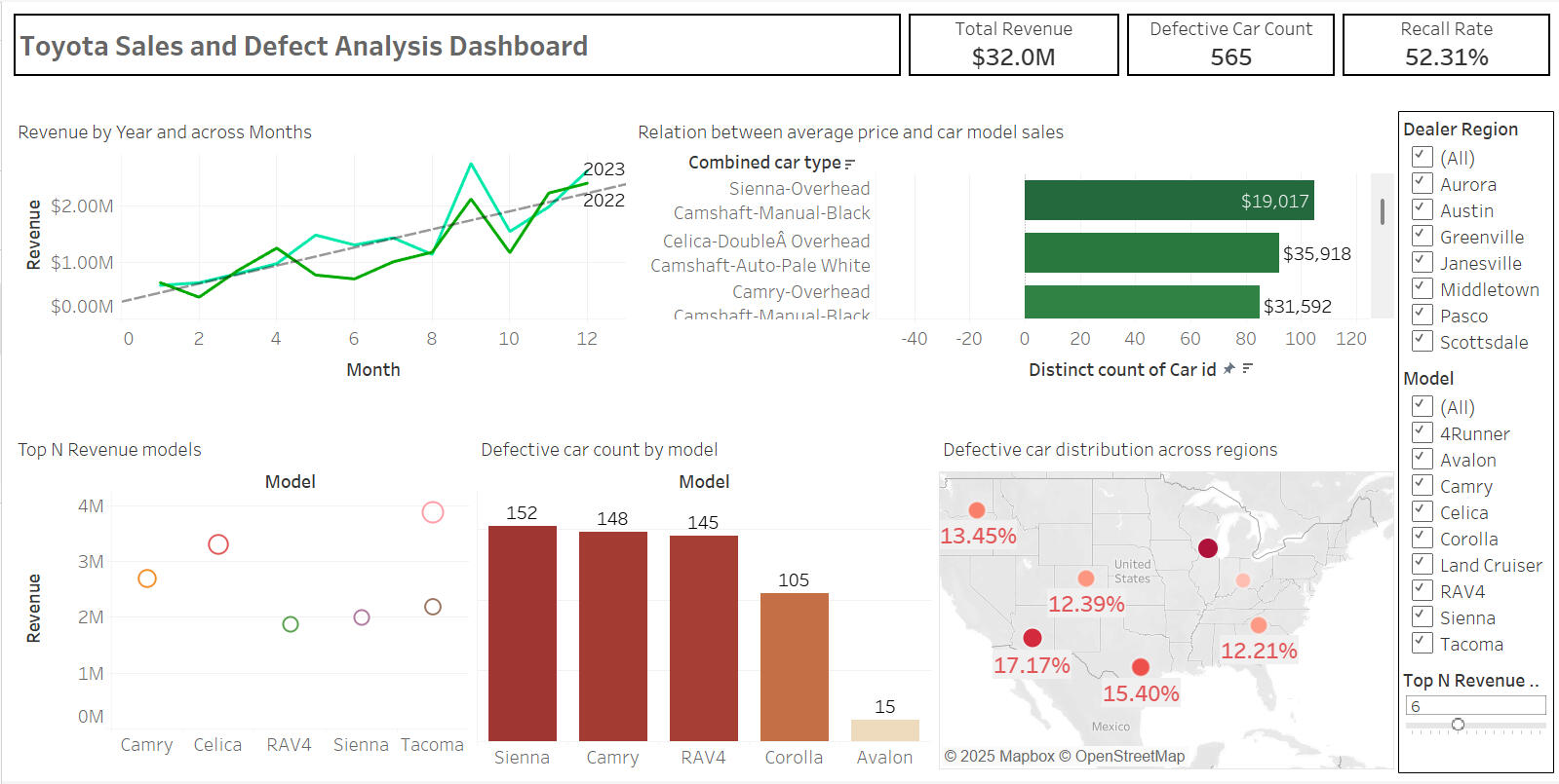 Here are my key takeaways from visualizations created to answer the business questions1.The Sienna has the highest defect count, with Janesville (19%), Scottsdale (17.17%), and Austin (15.4%) reporting the most defects, requiring targeted recall efforts.